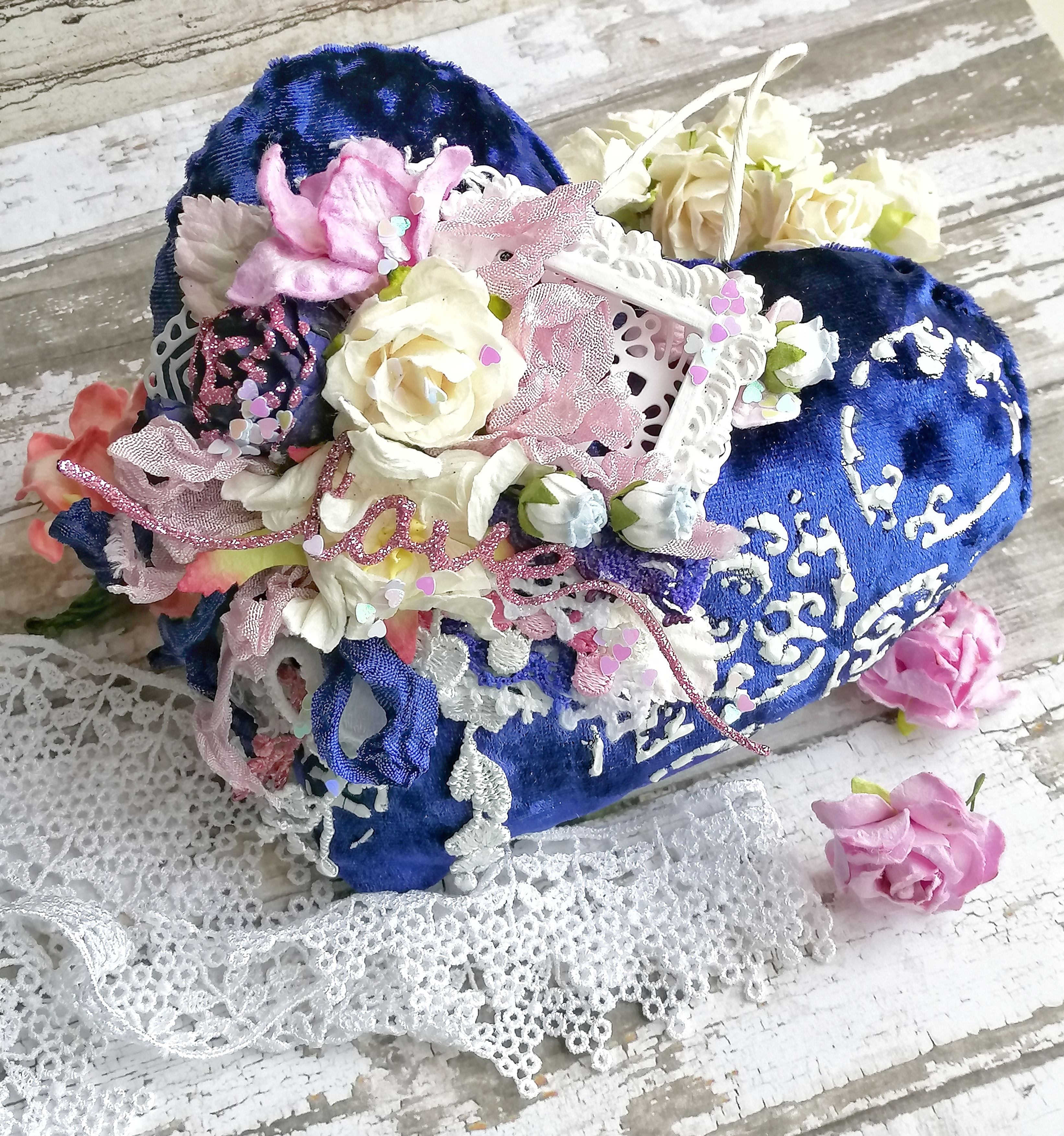 Затем немного вырубки, кружева, шебби лент, цветов, гипсовая рамка и пайетки