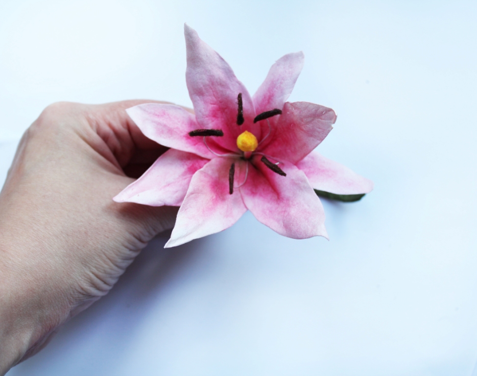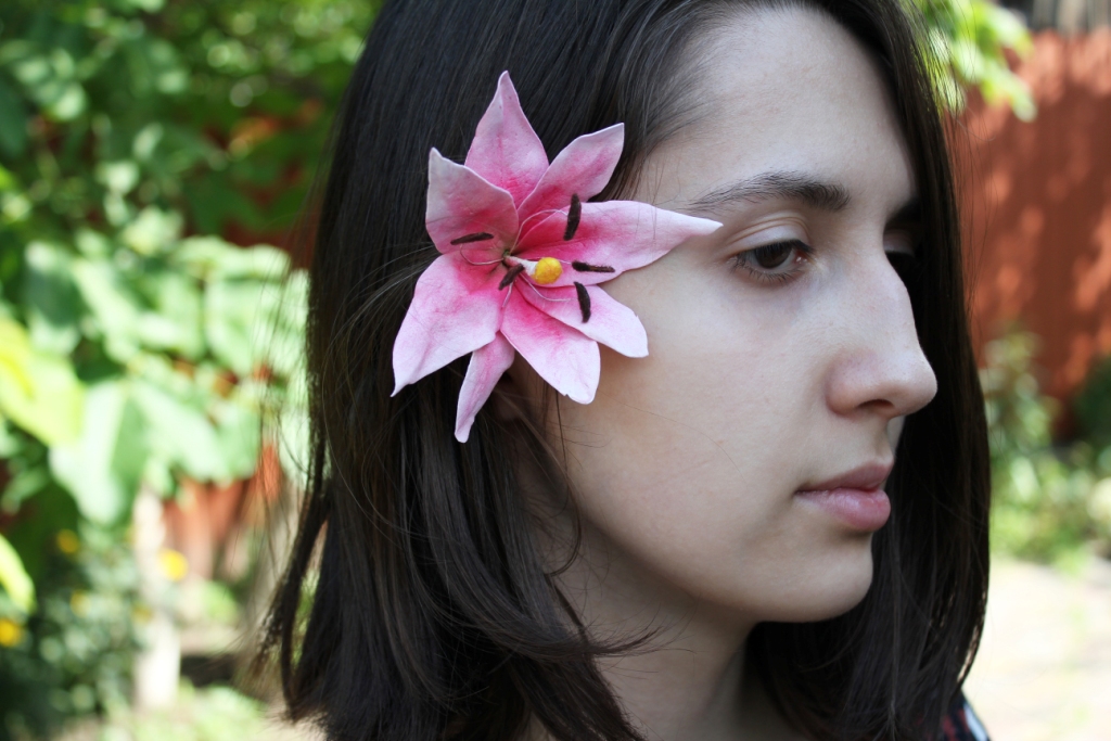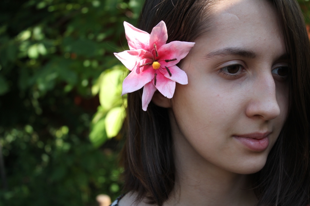 Помните мой пост про гребень с алыми розами? Теперь расскажу о втором заказе. Он был очень необычный. Девушка попросила сделать одиночный розовый цветок лилии, но так, чтобы он легко держался за ухом и не падал.