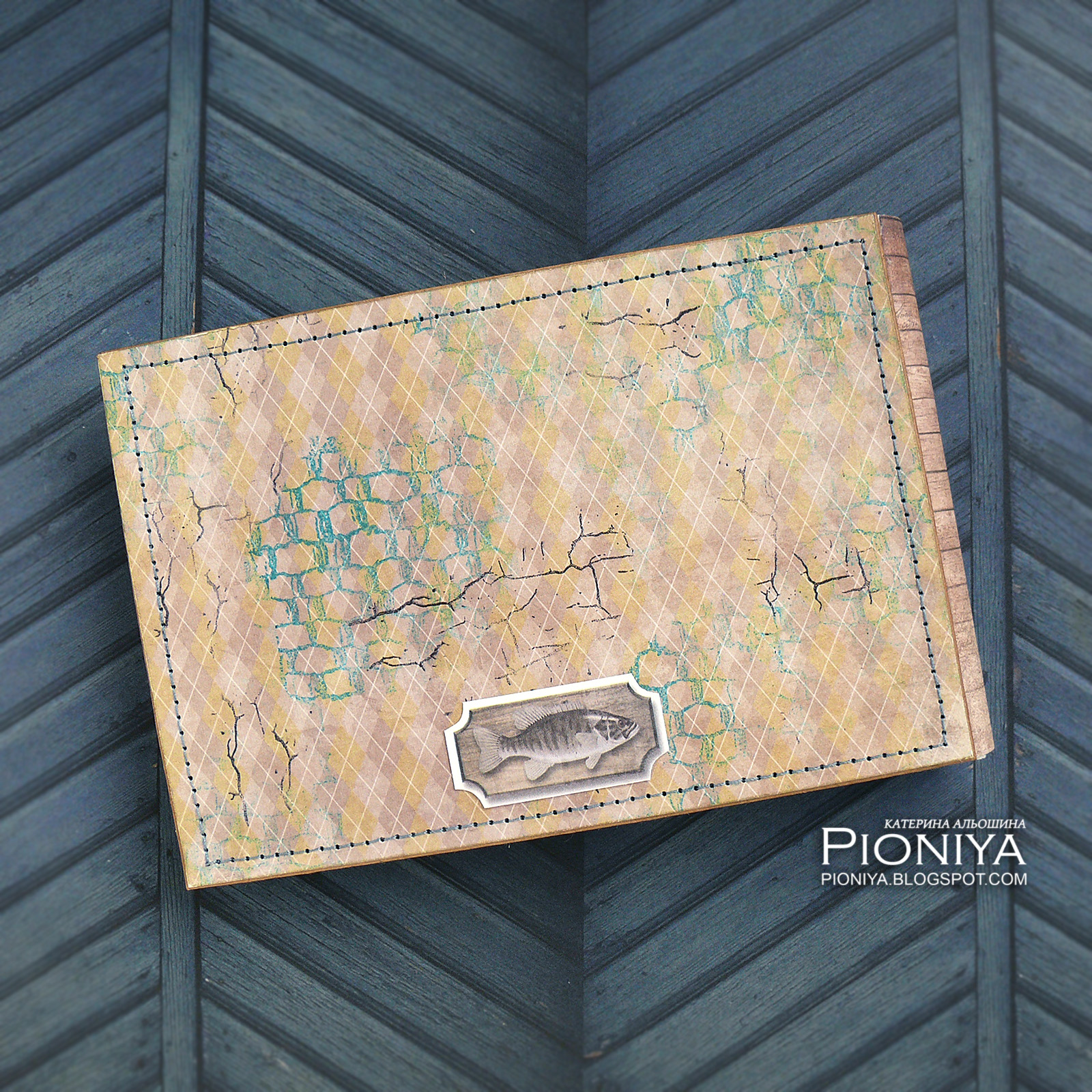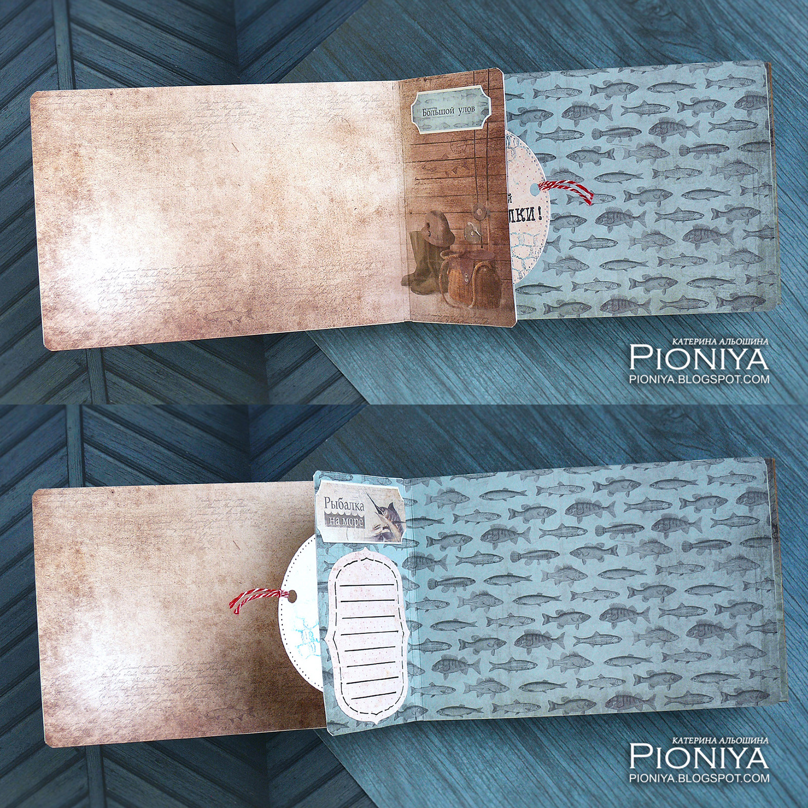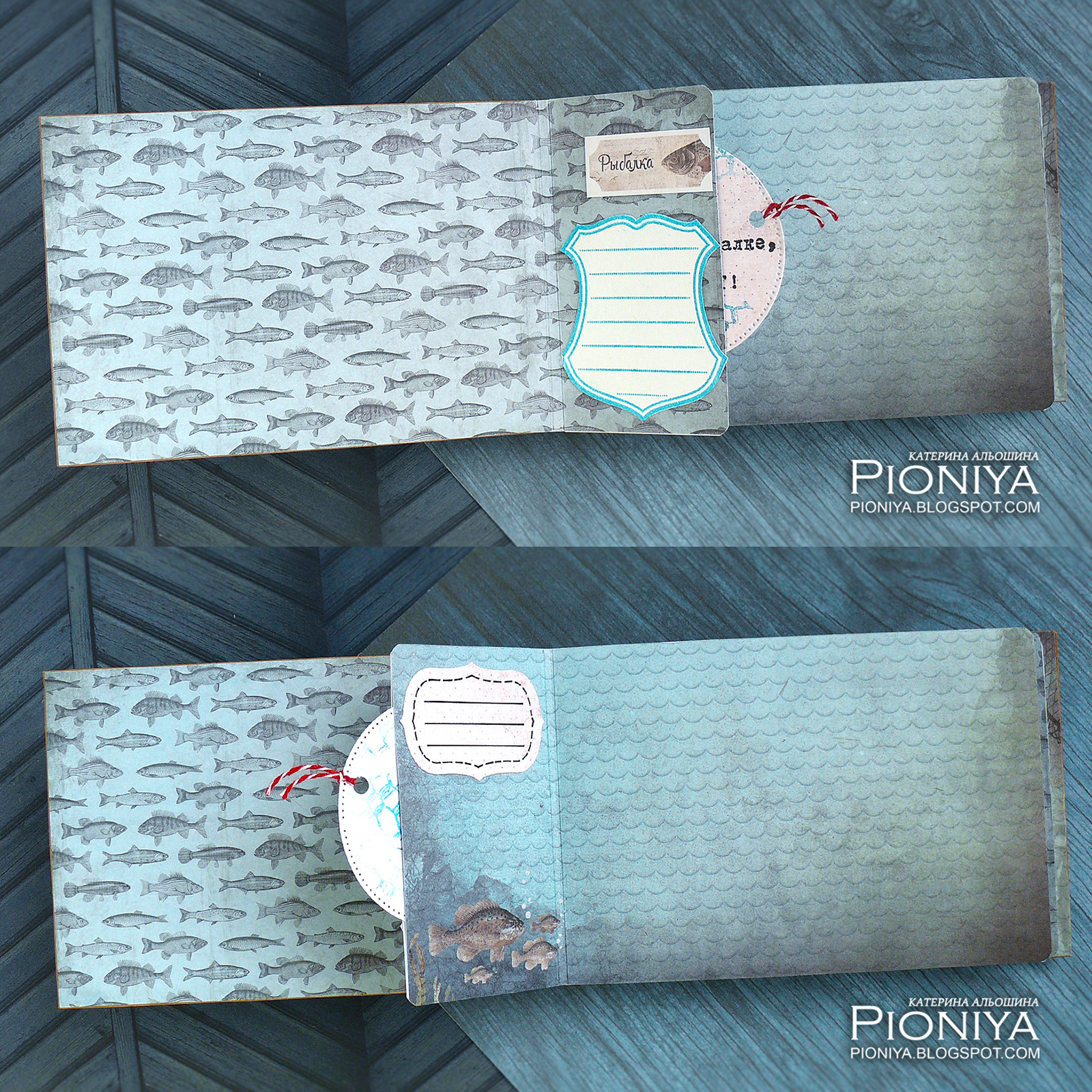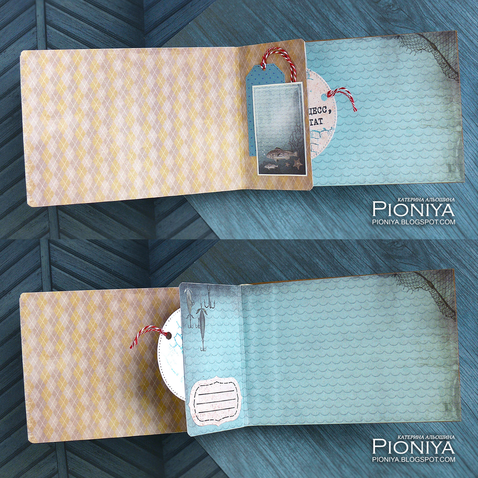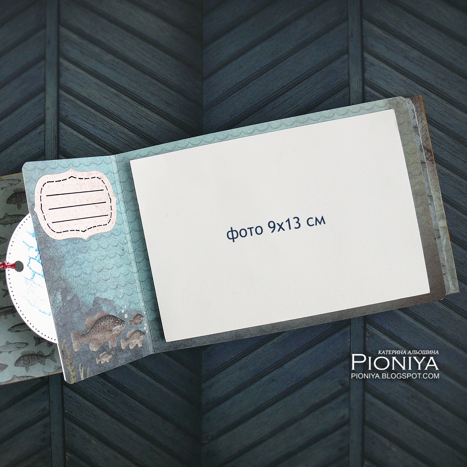 У всьому наборі паперу - Набор односторонней бумаги 20х20см Мистер Винтаж 12шт от Scrapmir, аркушів про риболовлю всього три. Тому склався мінік формату 14,5*10 см. Усього альбомчик вміщає 6 фото 9*13 см.