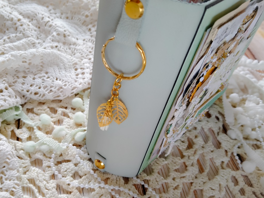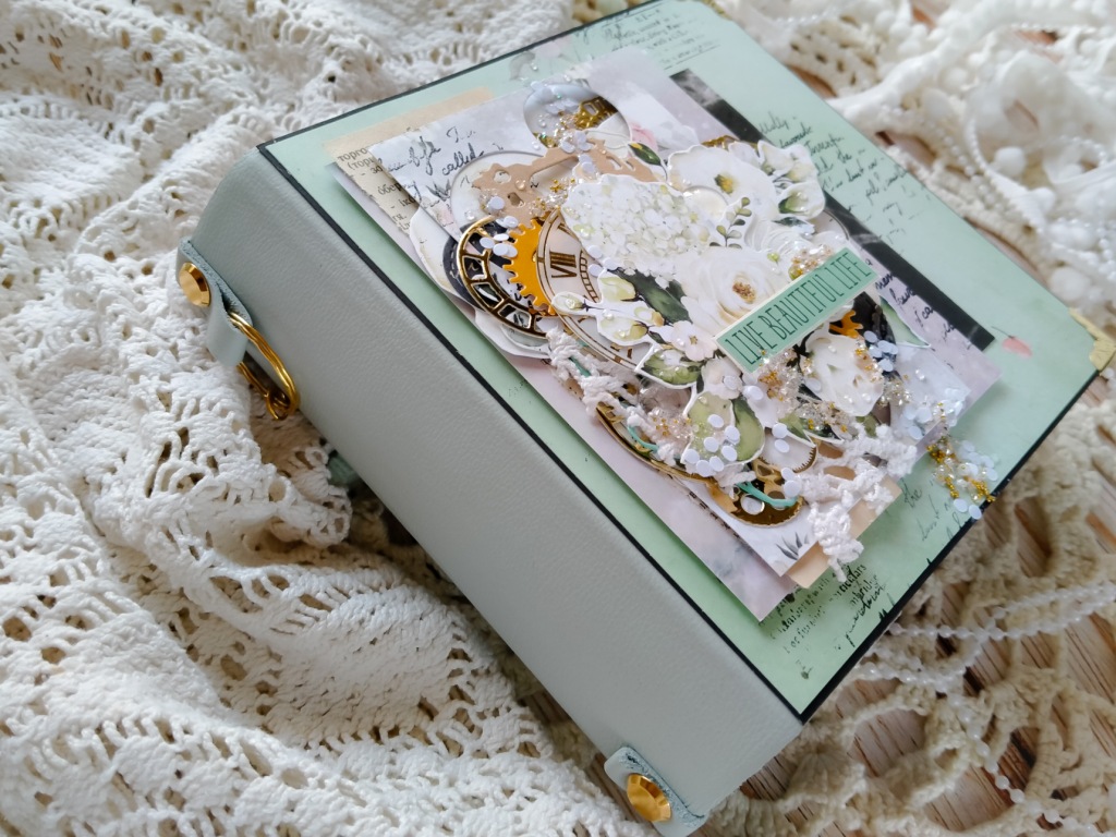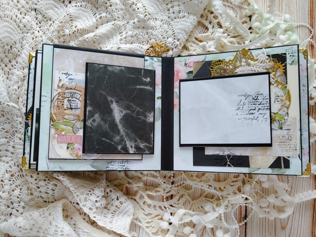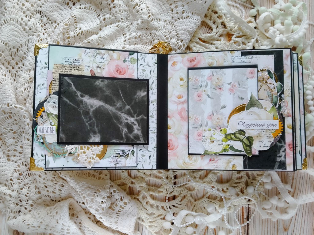 Фотоальбом формата 15*15 см на 4 разворота, корешок - натуральная кожа. А ещё на страничках добавлен ароматизатор :)