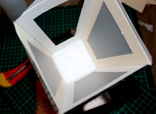 Одно окошечко осталось незакрытым. Эту сторону мы просто проклеиваем картоном, предварительно вклеив петли, на которых будет держаться дверка. Сразу же под картон вклеиваем хвостик от соседней грани фонарика и замыкаем его в круг.