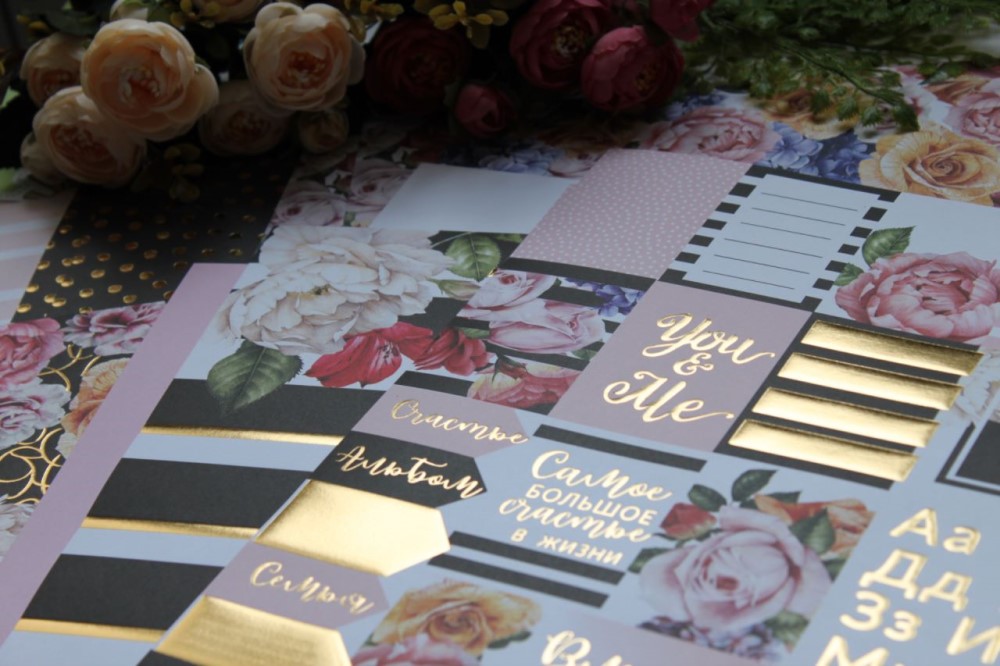 Черный цвет не рекомендуют использовать слишком много в живописи и творчестве, поэтому чаще всего в работах он присутствует в качестве дополнительного. Сочетания небольшого количества черного цвета с основным в работе пастельным бежевым, голубым, розовым, особенно дополненные золотым или серебряным фольгированием, дают запоминающийся и яркий эффект. Такой прием очень популярен среди дизайнеров любимого производителя многих скраперов Prima. Такие коллекции, как Midnightgarden, RoseQuartz, AmeliaRose, FlirtyFleur, MoonChildзатронули не одного любителя бумажного творчества в самое сердце.