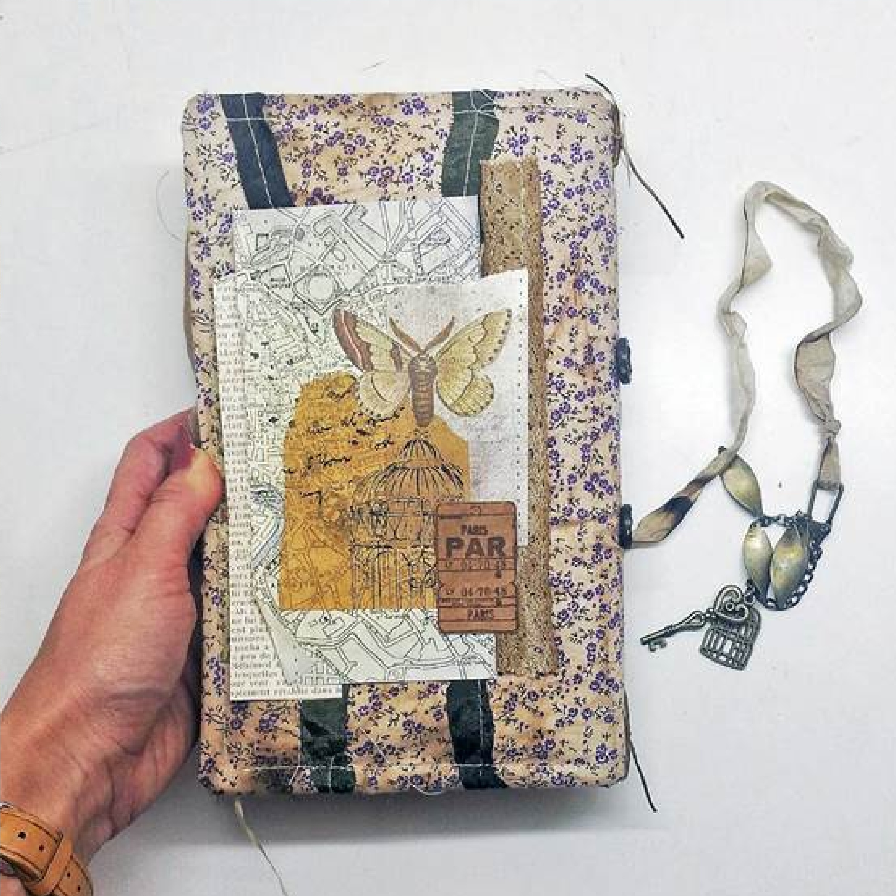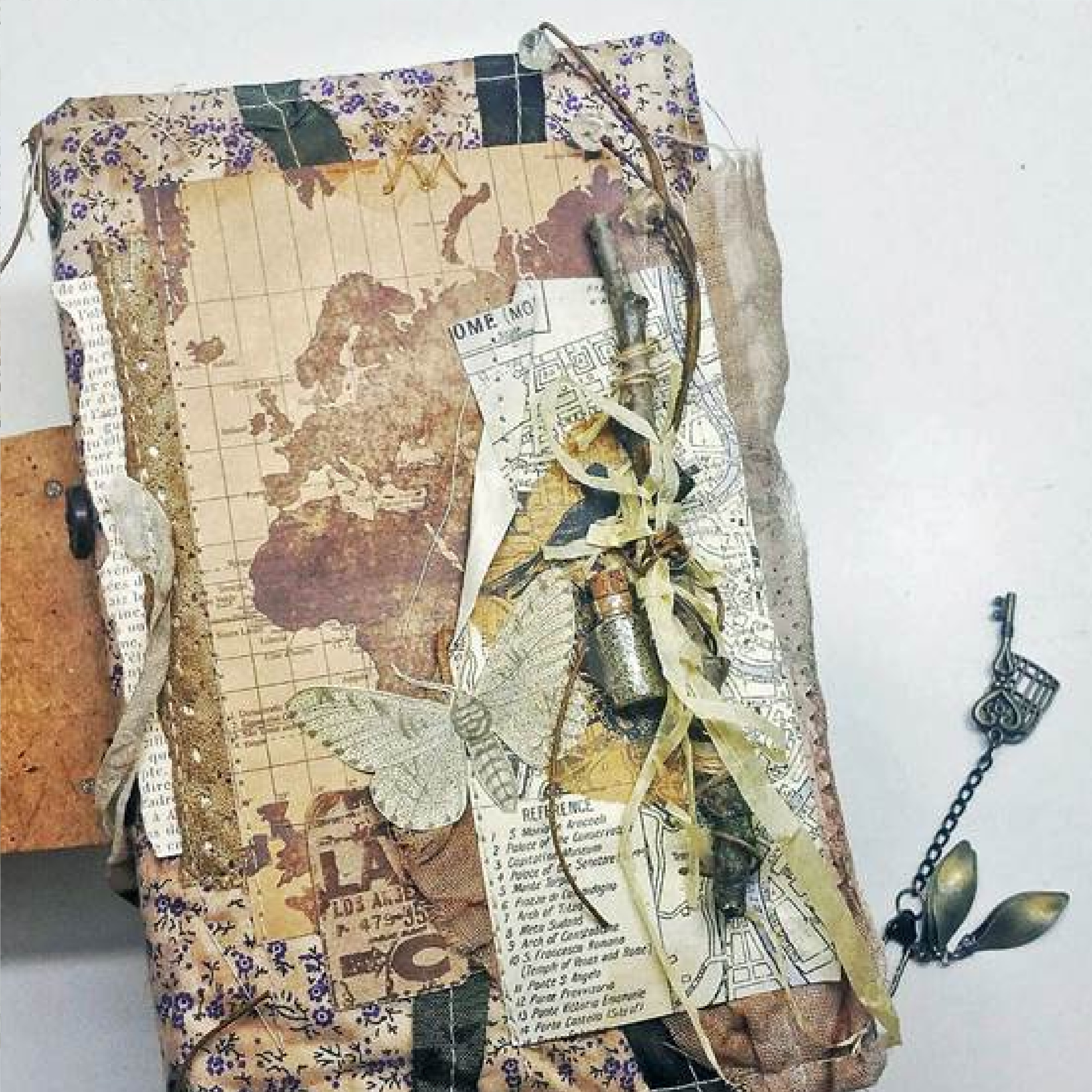 Немного состаренной ткани, бумага от 7gypsies с темой география, состаренная бумага и штампы.