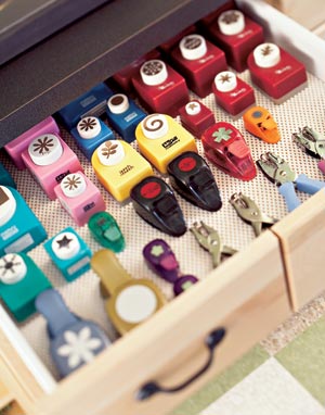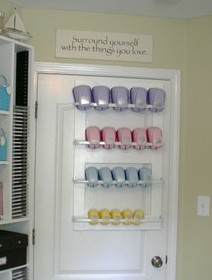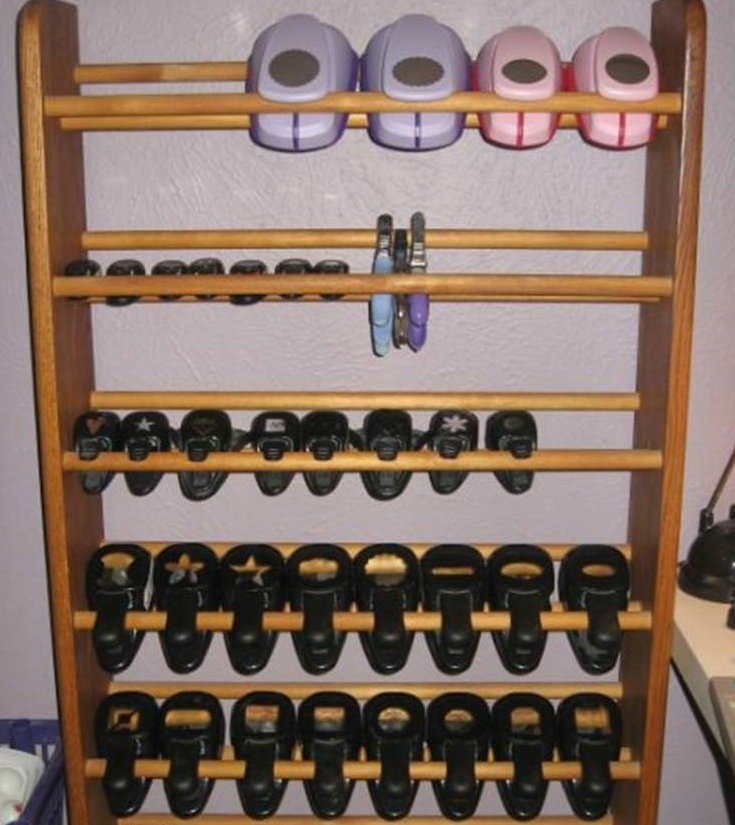 В іноземних скрап-блогах можна зустріти і такі ідеї:Зберігання діркопробивачів у висячому положенні на двері:Або на дерев'яній поличці: