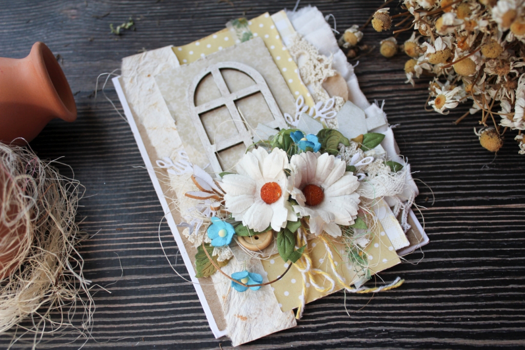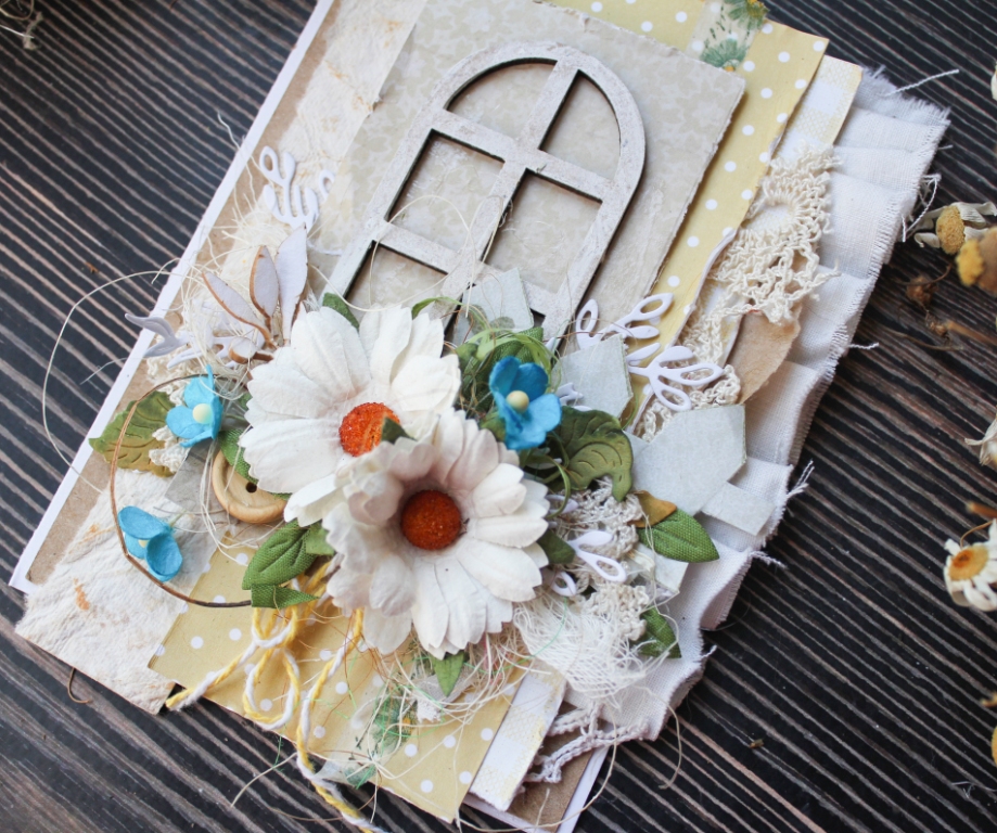 Вітання! Яскравого червневого сонечка вам в віконце! Як ваші справи? Як настрій? Червень - один з найулюбленіших моїх місяців з дитинства. Початок канікул, поїздки на річку і море, день народження, фрукти, тепло .. Можна продовжувати дуже довго, але повернемося до моєї роботи. Зробила з літніх мотивів листівочку в стилі кантрі. Ромашки, незабудки і віконце в будинку моєї бабусі. Все найтепліше і рідне зібрано на цьому клаптику паперу. Папір перешаровувати тканиною, шматочками мережив і в'язаних серветок.
