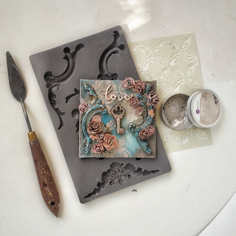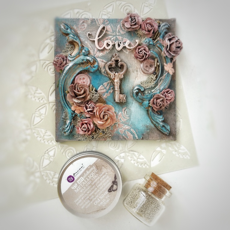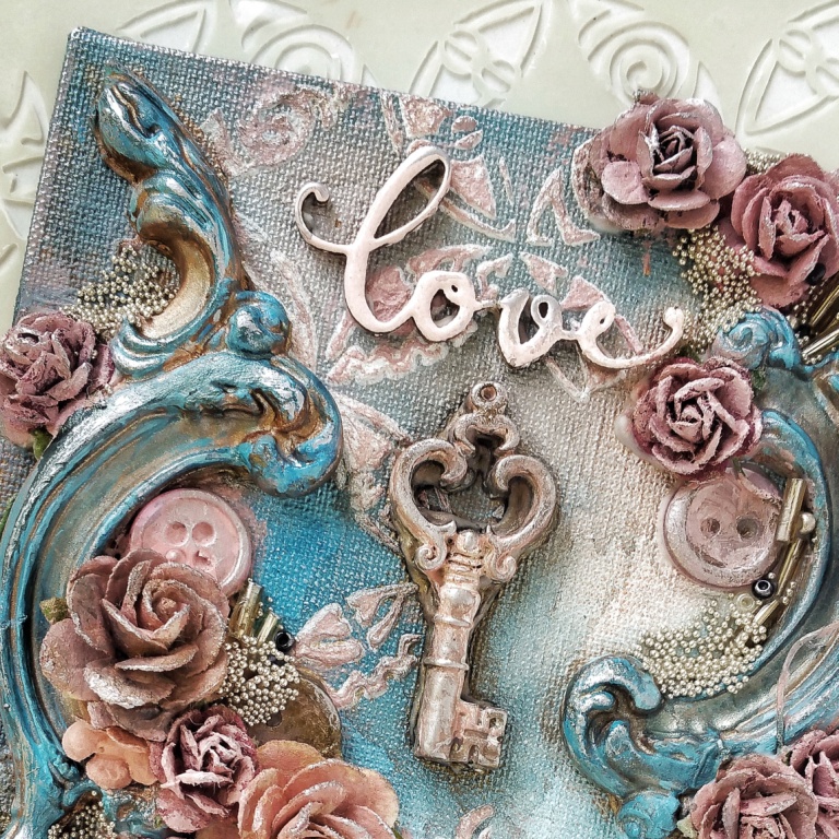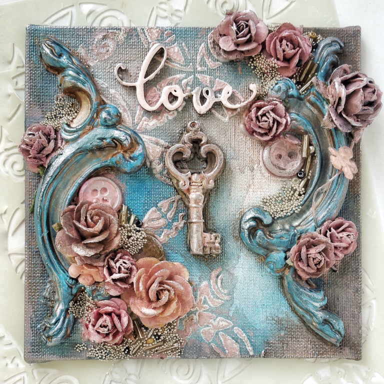 Міні-полотно "Love Key"Шик, блиск, краса!)Така дрібничка буде вас радувати в будь-якому місці вашої квартири.Основа розміром 10х10 см обтягнута тканиною.Гіпсові вензелі, квіти, мікробісер .. ах так, ще ключик, чіпборд і віск-металік. ГОТОВИЙ!)Маленький красавчик)