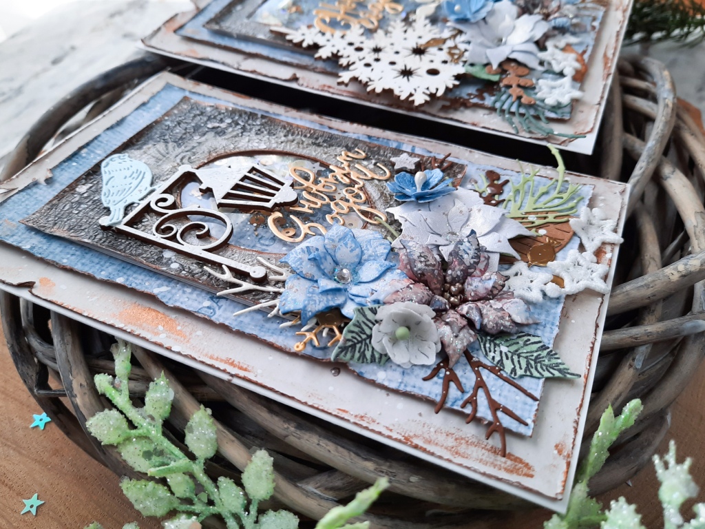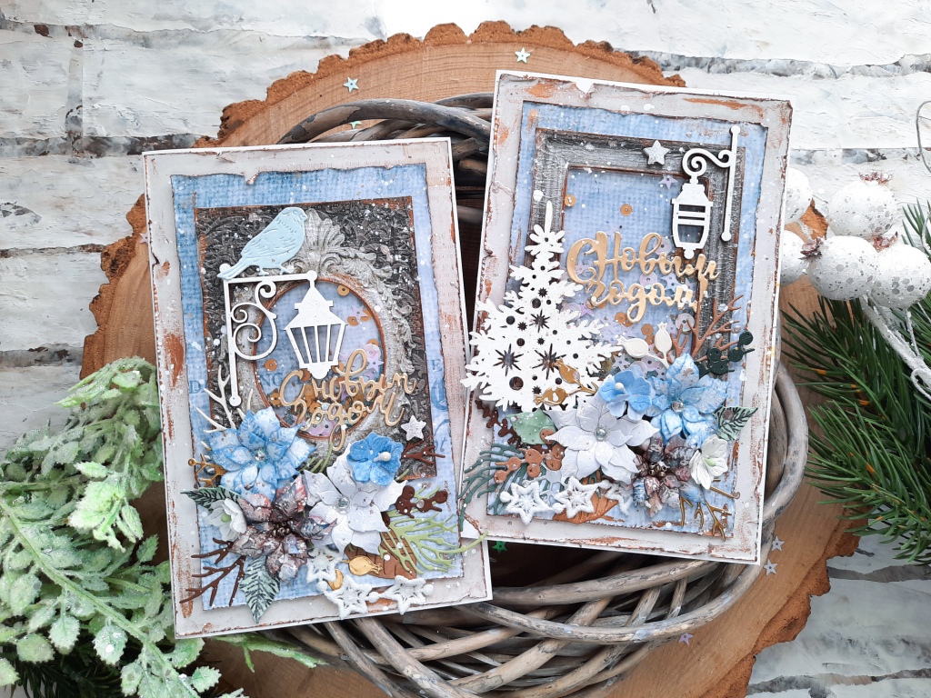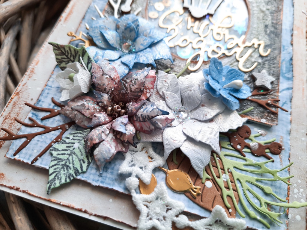 3. Скропити роботу розведеним з водою білим акрилом. Ці крихітні крапельки-сніжинки додадуть роботі завершеність і багатошаровість. Для листівок використовувала папір KaiserCraft, чіпборд від ScrapBox, білий акрил від Rosa talent.