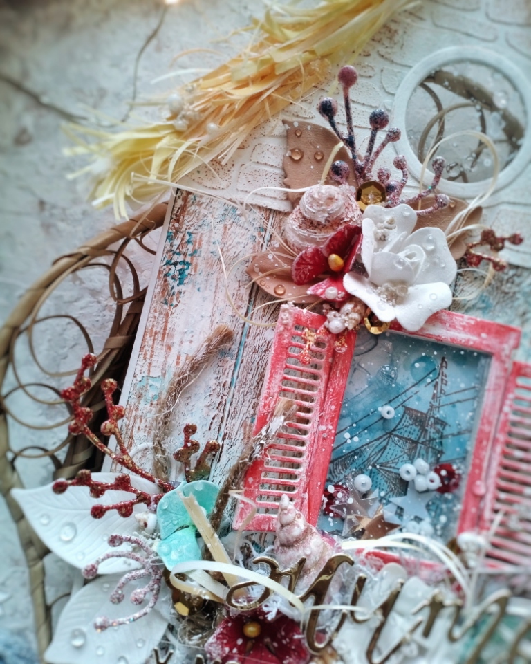 Для декору я використала саморобні квіти, тканина, рафію, сизаль, фігурки з полімерної глини - в тому числі і черепашки, зроблені за допомогою силіконового Молда "Мушлі". Вирубку гілочок покривала пудрою для ембоссінга в кілька шарів, щоб зімітувати різні корали і підводні рослини. Для написи знову використовувала улюблений на даний момент прийом - вирубка алфавітними ножами з золотого картону. Топінги - невід'ємна частина моїх робіт. Кришталевий топпинг, пісок, бісер, мікро-черепашки, а також краплі води за допомогою прозорих дропси - все для створення морської атмосфери. Як і бризки білою фарбою, звичайно.