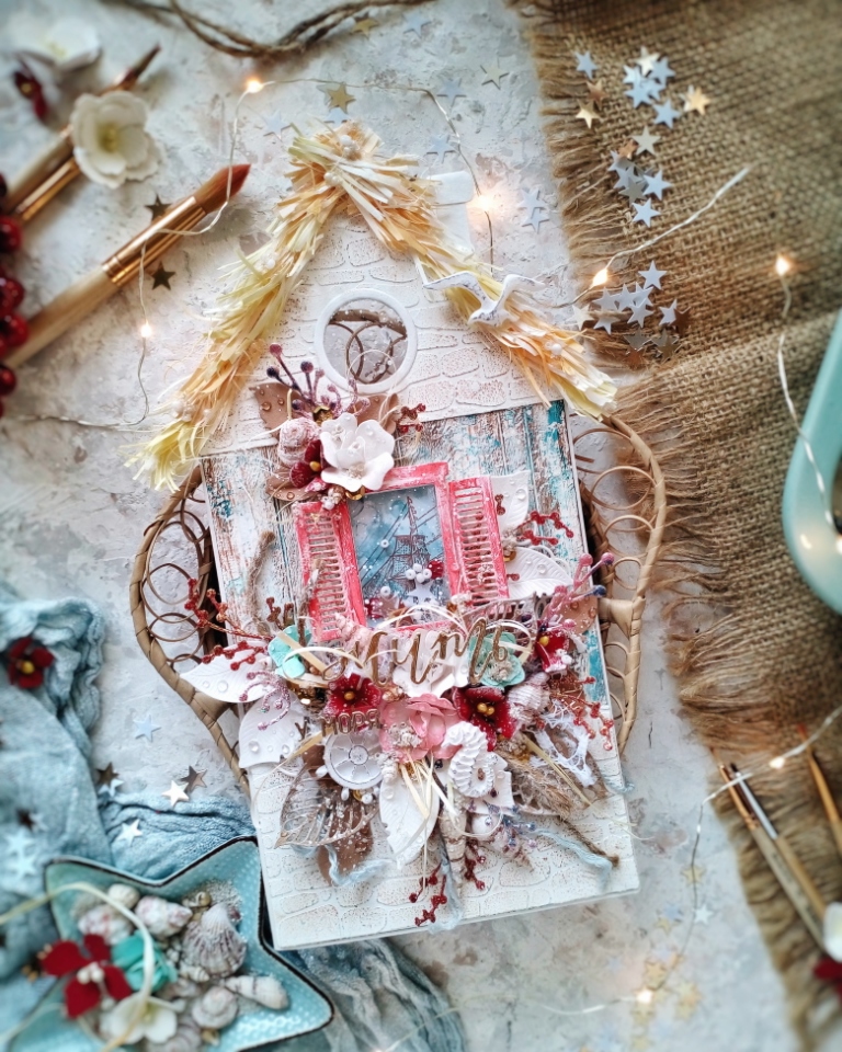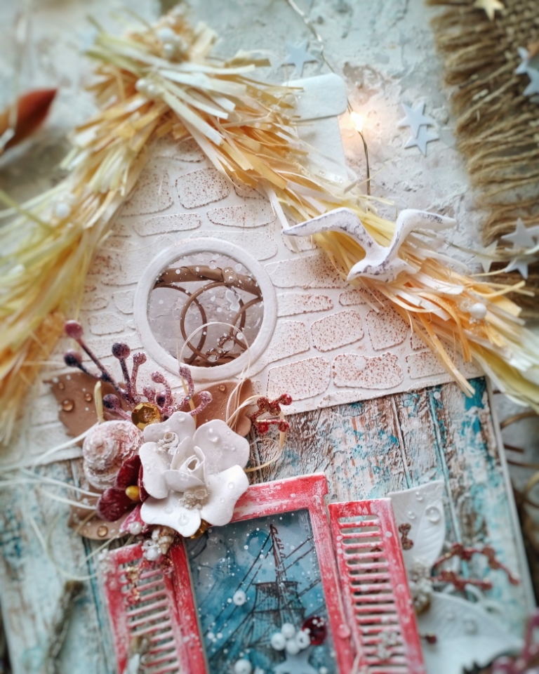 На інших частинах будиночка я зробила фактуру каменю текстурной пастою через трафарет і злегка пройшлася по ній коричневою фарбою. Дах покрила пучками рафії. Тепер можна все склеїти і зайнятися прикрасою. Знову в головній ролі вирубка Mimi cut "Розкрийте навстіж вікна", в цей раз я перетворила її в шейкер.