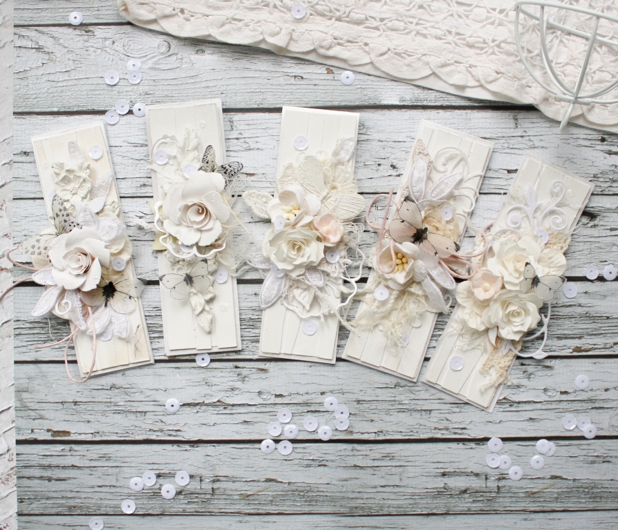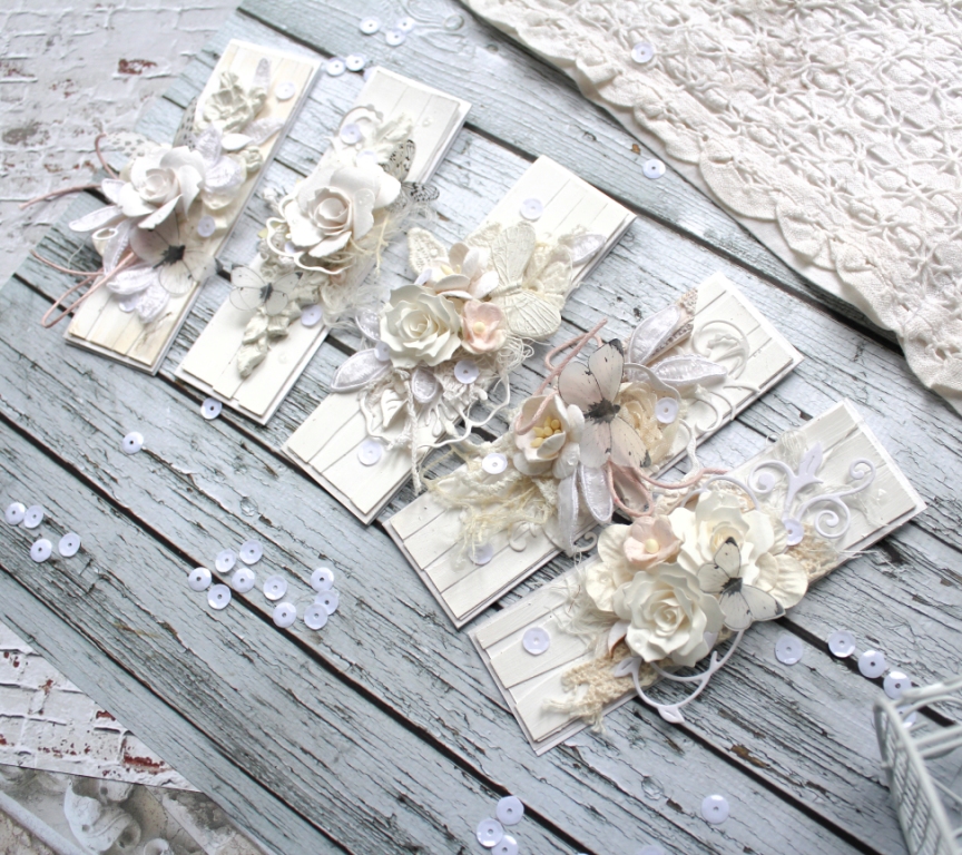 Цього разу я зробила набір скраплінгов практично в стилі Шеббі - шик. Підкладка - імітація досточек + квіткова композиція. До речі у мене є пропозиція до всіх дизайнерам. Скраплінгі (як і АТС і багато малі форми) мають канонічні, фіксовані розміри. В даному випадку 1.5 "x 4.5" дюймів. Якщо переводити це в сантиметри, тобто більш зрозумілі для нас розміри, вийде приблизно 3, 80 x 11,40 см Це дуже незручно. Тому моє реченні полягає в округленні значень для зручності. Вийде 4 x 11,5 см Неозброєним оком це абсолютно не помітно і на форму ніяк не впливає, але у нас буде свій еталон розмірів малих форм. Більш зрозумілий і зручний.