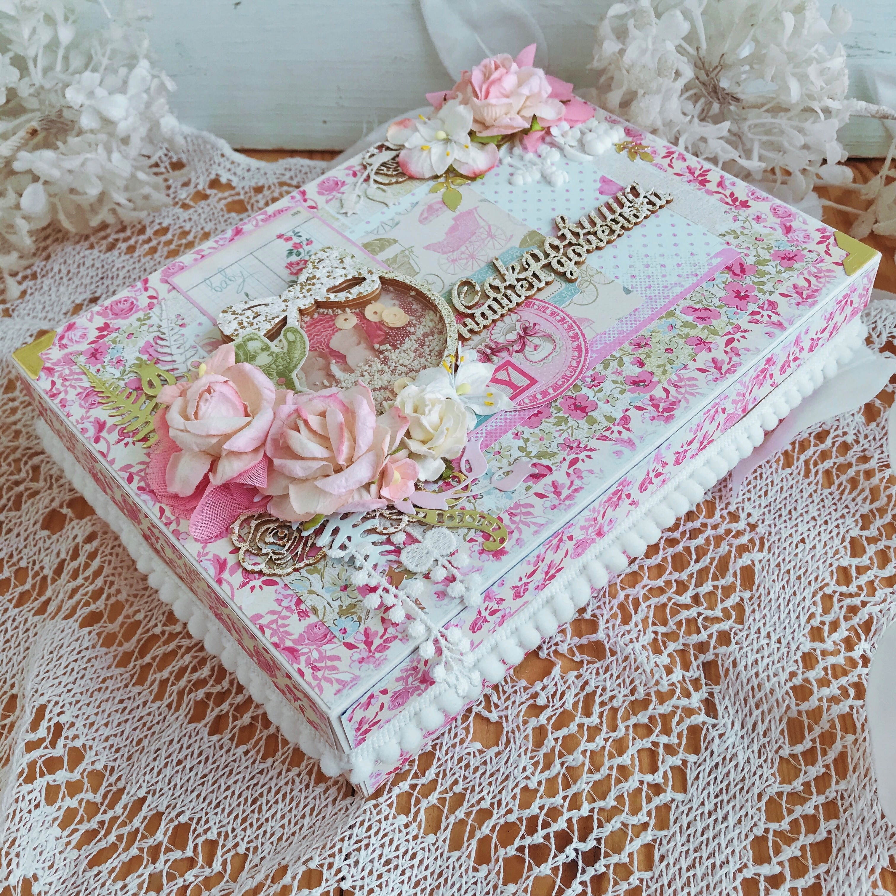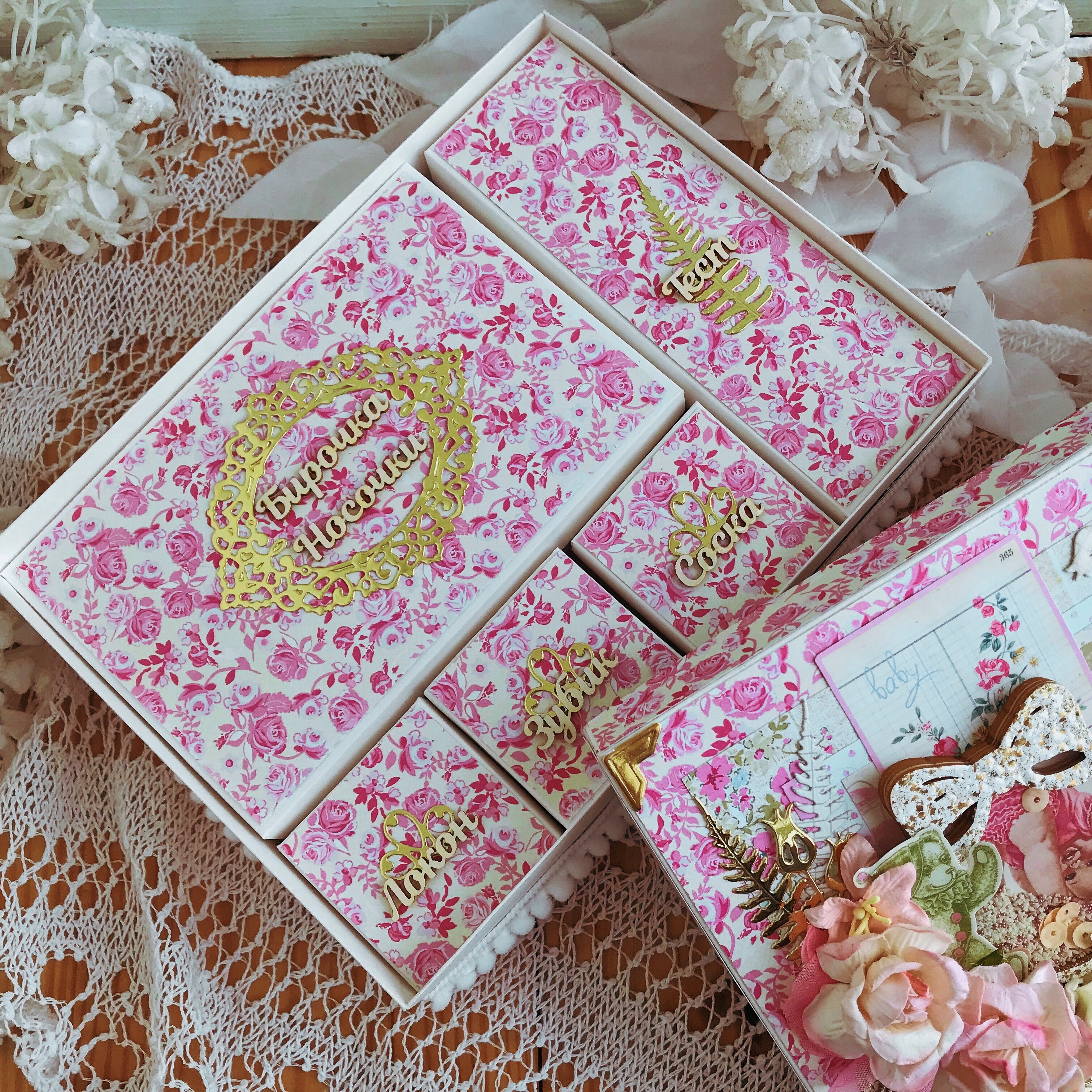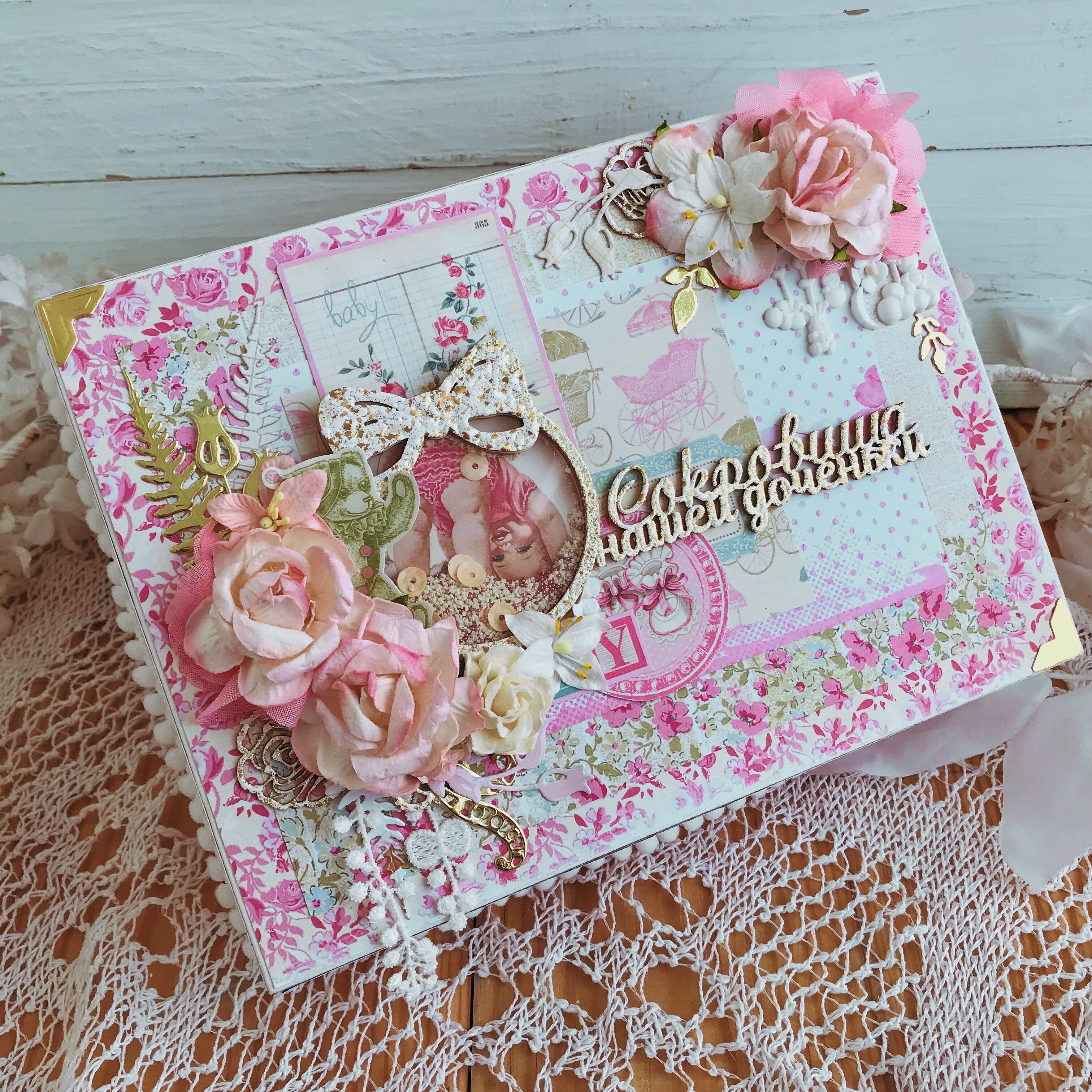 20.04.2019 16:22Детская тема - это всегда нежность, особенно если работа создаётся для маленькой принцессы. Цветы, кружева и немножко золота - что ещё нужно?) Сокровищница получилась нежной и в то же время яркой. Внутри собраны коробочки для ценностей и карточки для записей.