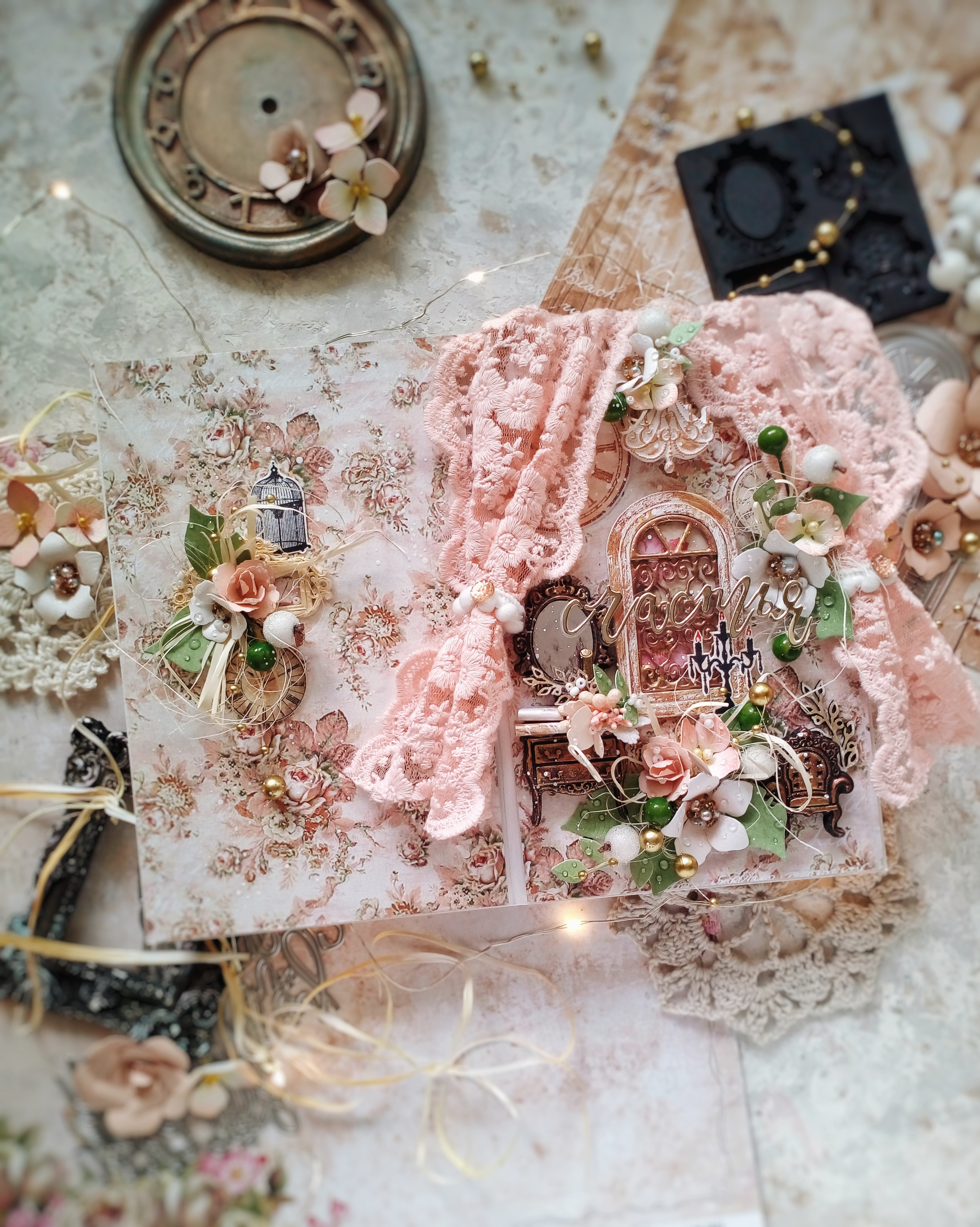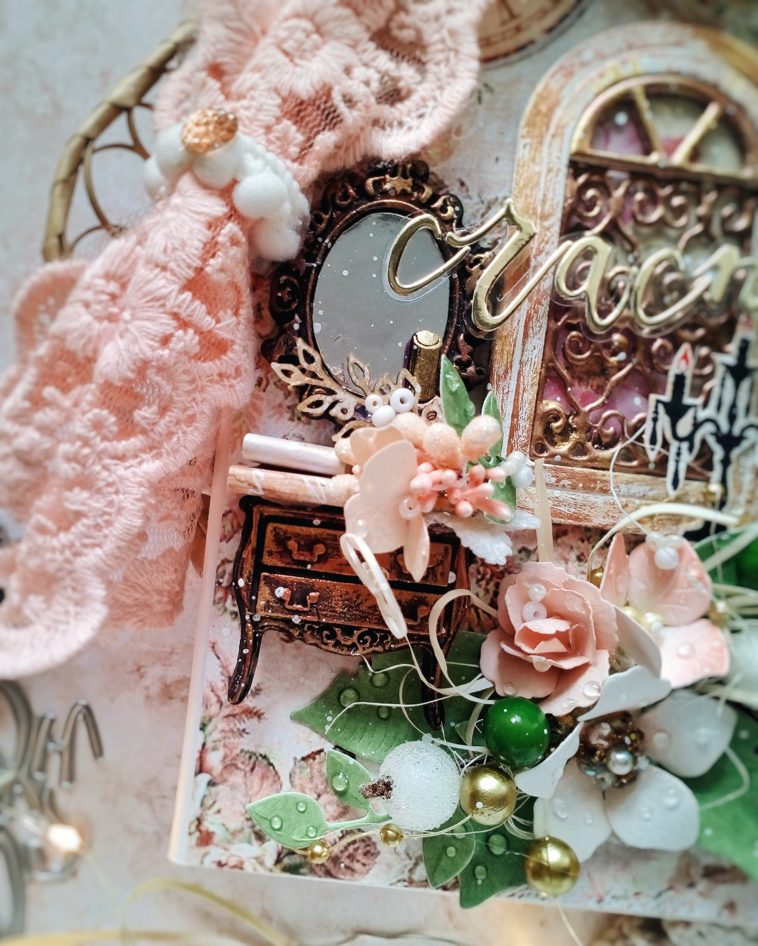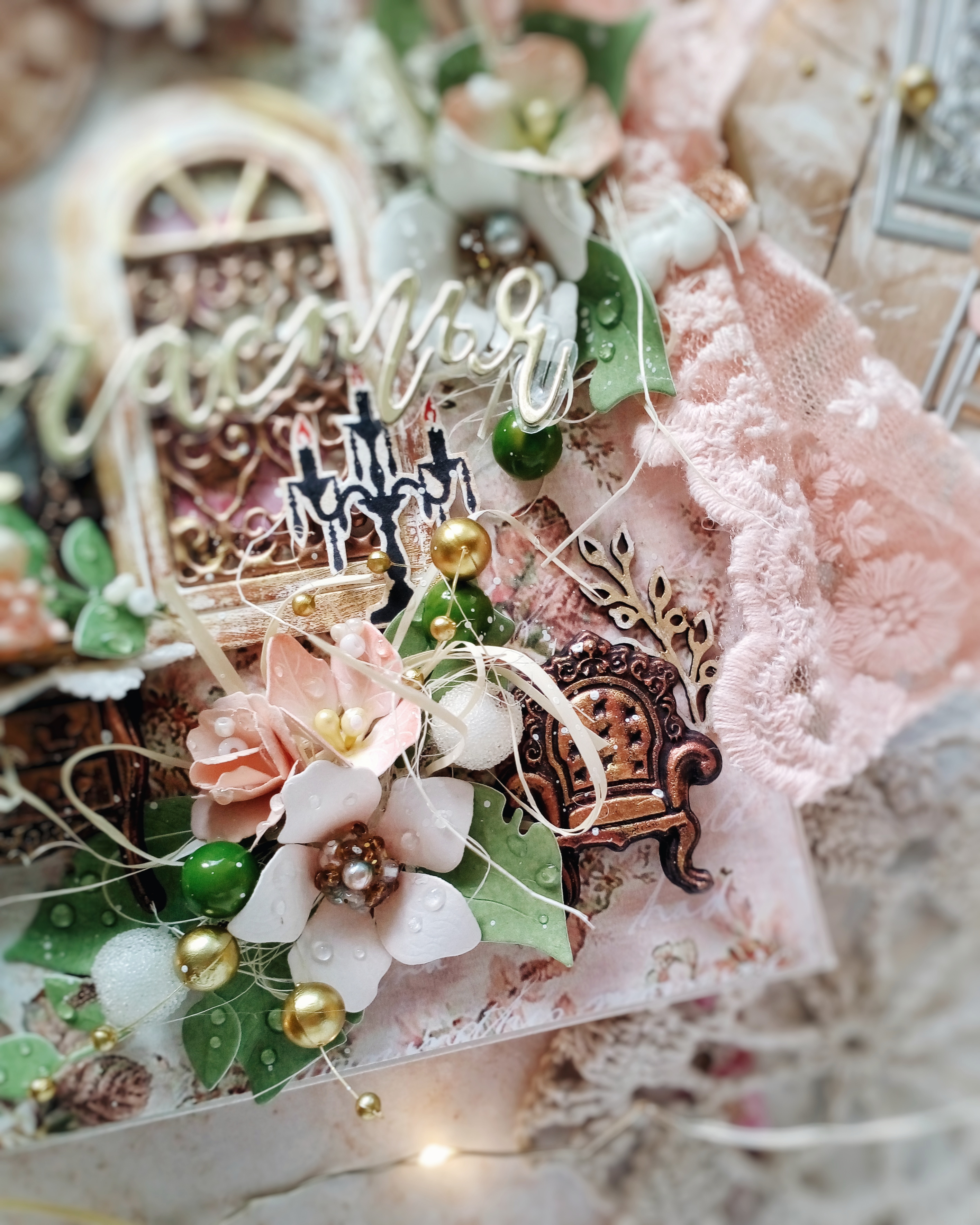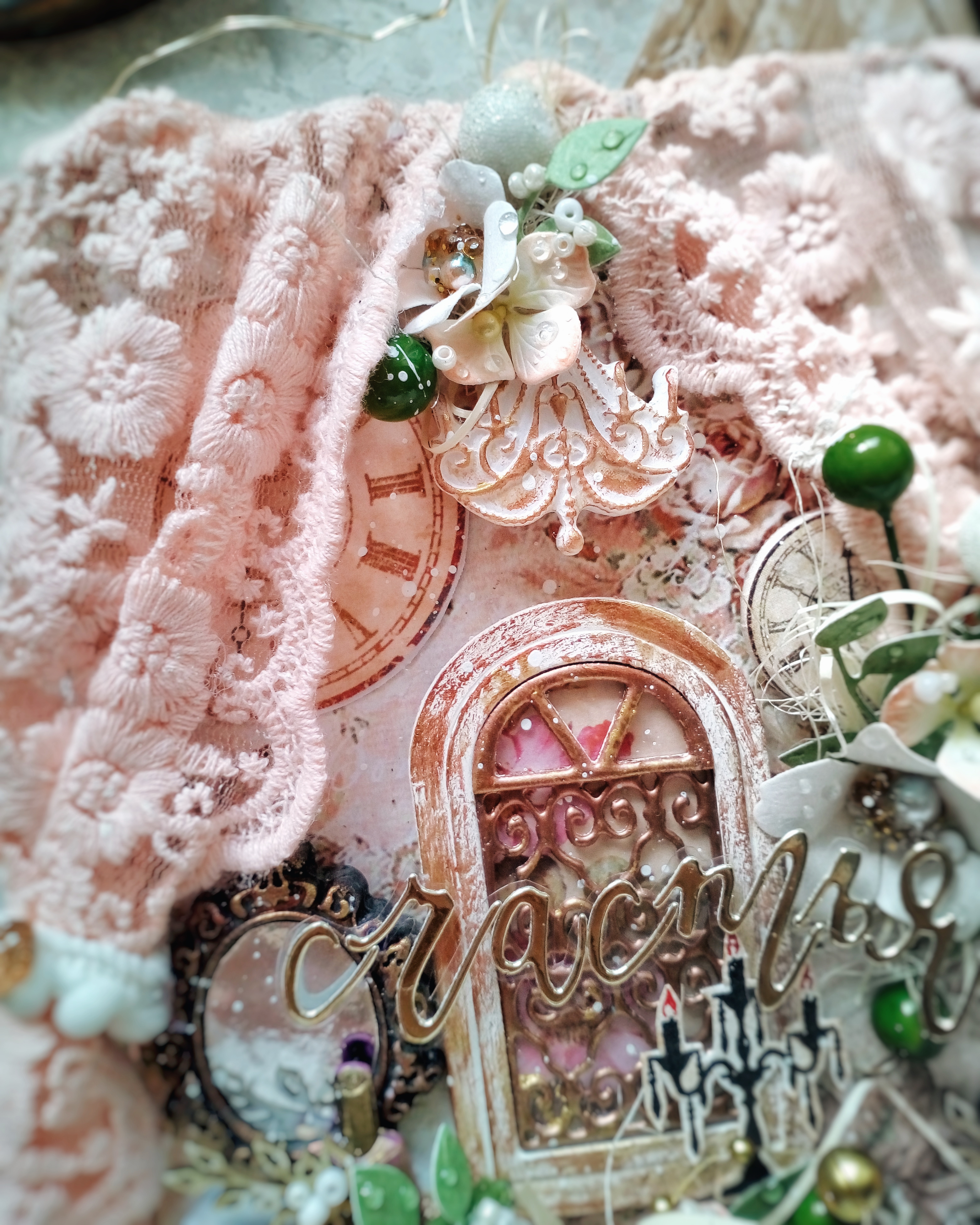 Для разнообразия фон из скрапбумаги с цветочным принтом, как старые обои. Шторы я сделала из широкого кружева, а окно - это вырубка из набора "Распахни настежь окна" от Mimi cut, на этот раз более ажурным и женственным ножом. Внутреннюю часть окна покрыла медной пудрой для эмбоссинга и добавила "стекло" под низ из плёнки.