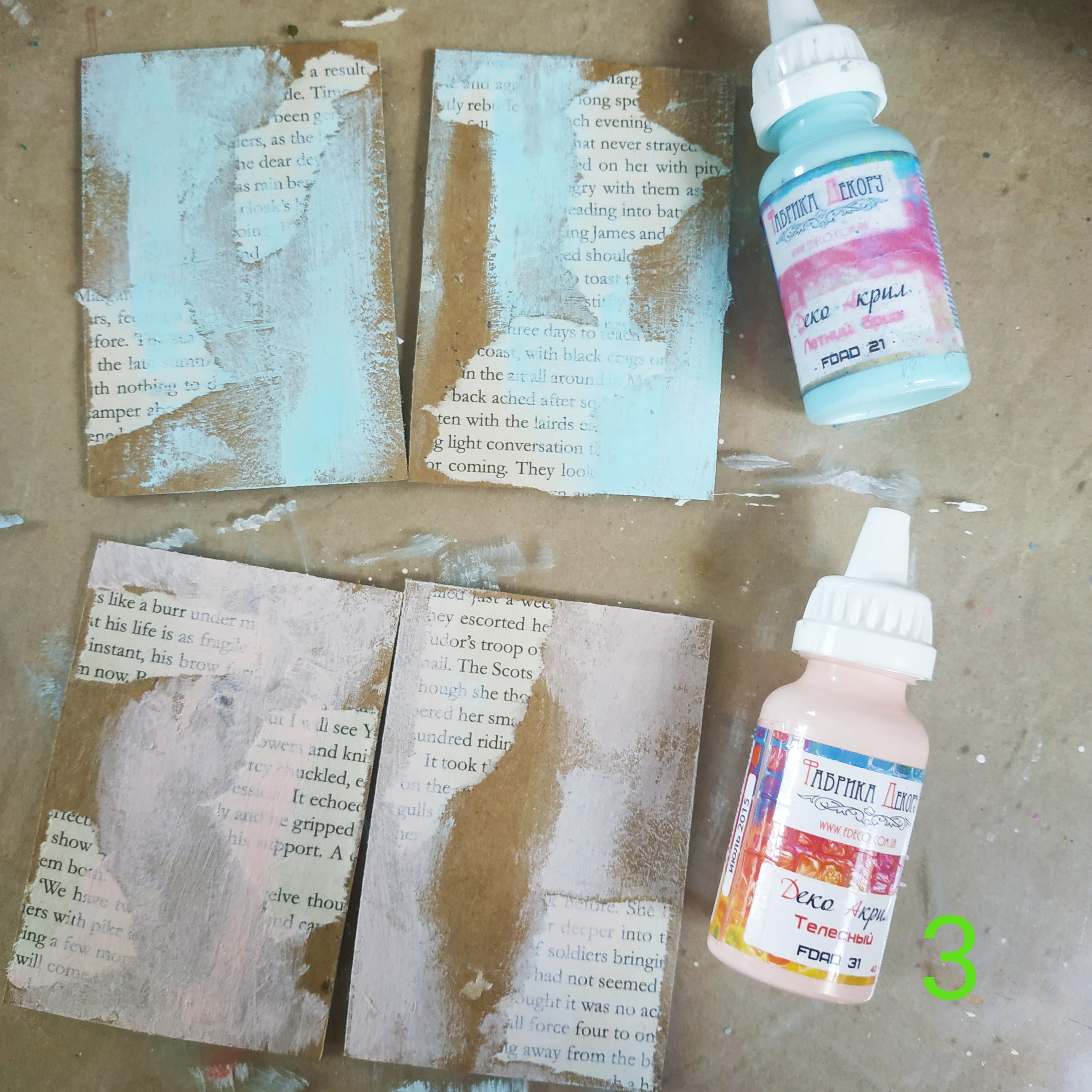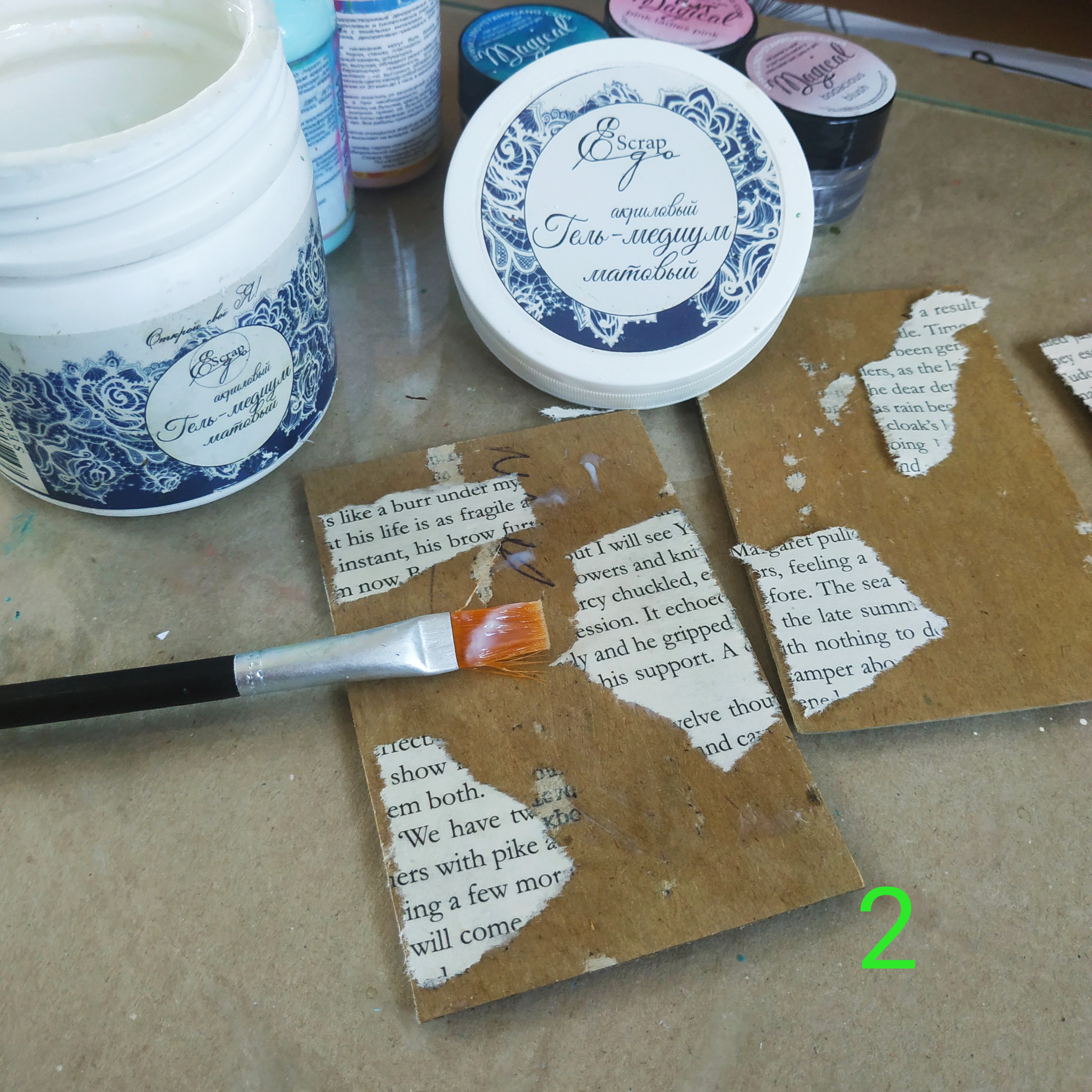 2. Работаем с основой: я на медиум от @scrapego приклеила обрывки книги, затем немного добавила цвета акриловой краской от @fabrikadecoru .