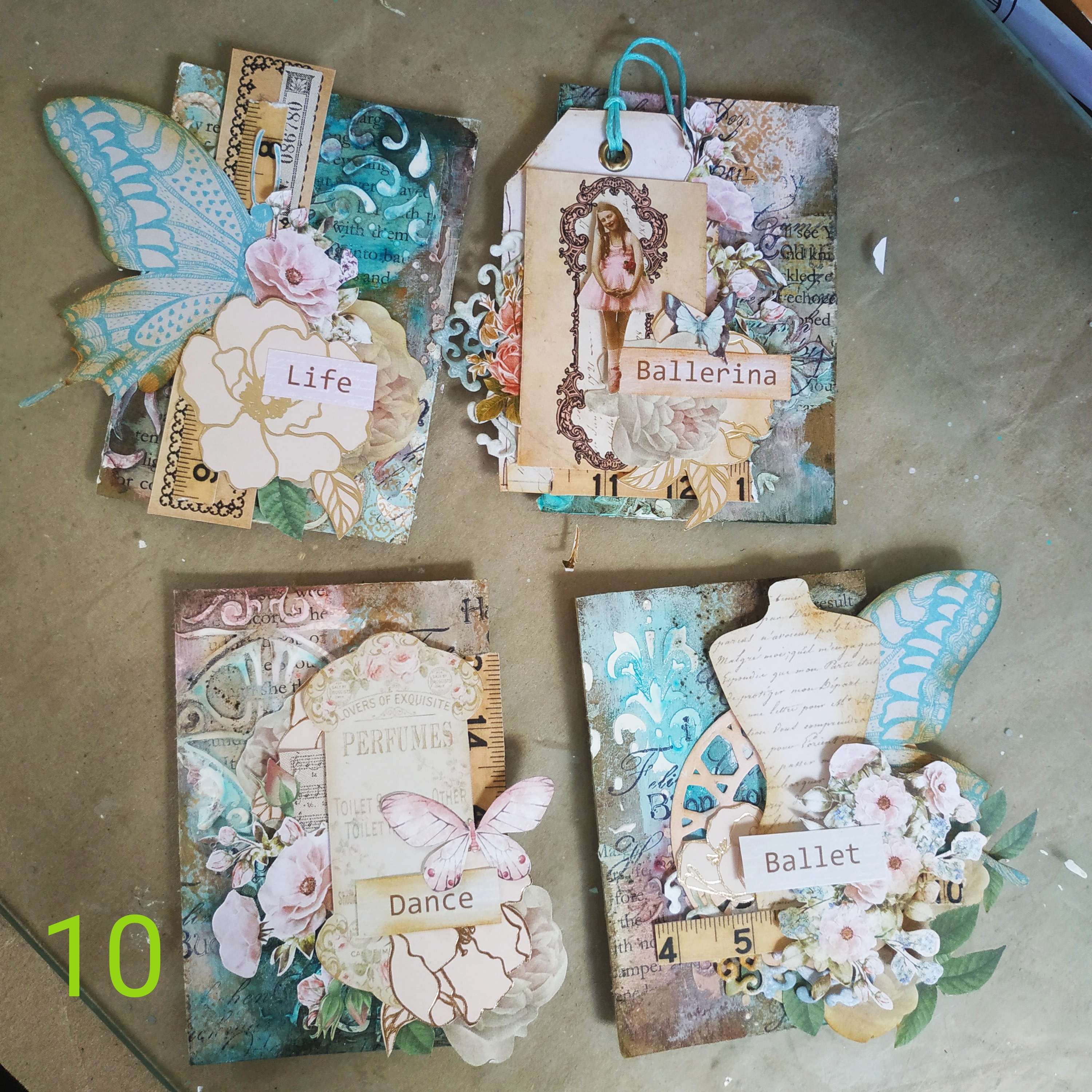 5 Составляем композиции на наших АТС, они не обязательно должны быть по одинаковому расположены на всех карточках, ведь они уже объеденины общей темой и цветовой гаммой. В композиции можно использовать: высечки, вырубку, кружево, бумагу тишью, цветы, металлические и гипсовые украшения, тесемки и шнуровки и многое другое)